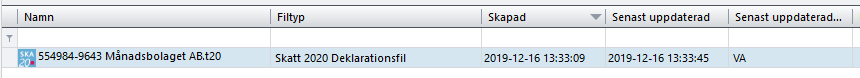 Ett exempel, här har jag sparat en deklaration 191216 men klientens räkenskapsår är 191231. För att komma runt detta så måste deklarationen sparas om efter 200101 i detta fall, alltså efter att klientens räkenskapsår är avslutat.