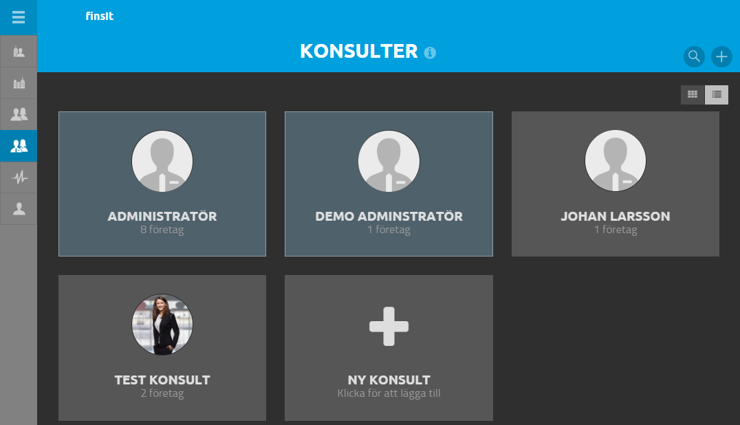 • Byråadministratör kan se alla byråns företag och användare, både företagsanvändare och konsulter. Den kan också bjuda in nya konsulter och har rättighet att radera företag och konsulter.
