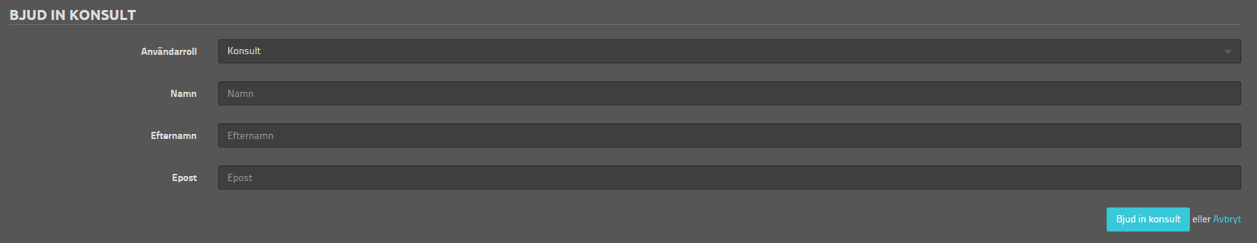 Därefter fyller du i alla uppgifter på samma sätt som med företagsanvändare och avslutar med att klicka på Bjud in konsult. Det finns två olika roller att välja mellan för användare hos byrån, dessa beskrivs nedan.