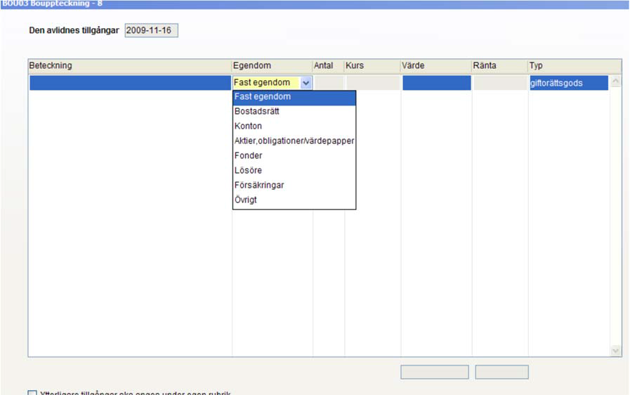 Arvlåtarens samtliga tillgångar hanteras på en och samma sida. Du anger beteckning på tillgången, vilken sorts egendom det är fråga om och typ av egendom. Vilka val som är möjliga beror på arvlåtarens civilstånd. Du väljer egendom genom att klicka på pilen vid fältet. Du får då upp en lista över de olika rubriker egendomen skall hänföras till. Du kan också skriva första bokstaven i fältet och därefter Enter. Rubriken kommer automatiskt upp. Programmet kommer ihåg den senaste egendomsslaget du valt och föreslår det till nästa rad. Skuldsidan ser ut och fungerar på motsvarande vis. Detsamma gäller inmatningssidorna för efterlevande makes/partners/sambos tillgångar och skulder.