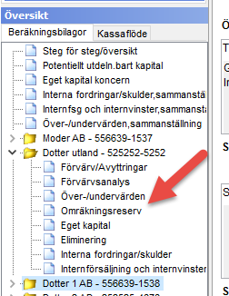 - Sidan för omräkningsreserv finns som en egen beräkningsbilaga under det utländska företagets mapp i förvärvsmodulen.