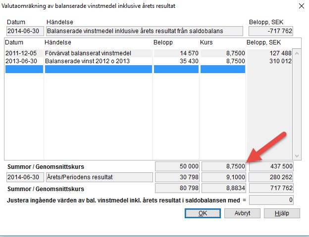 - När du klickar på spaden ser du vilka förändringar som skett av posten sedan förvärvet. Du ser också vilken kurs varje förändring räknats om till. Det vanligaste är att det är beloppet vid förvärvet som räknats om till förvärvskurs och sedan resultatet i dotterföretaget som räknats om till genomsnittskurs respektive år. Det är kursen före årets/periodens resultat som du skall ange på saldosidan efter att du bytt till nytt räkenskapsår.