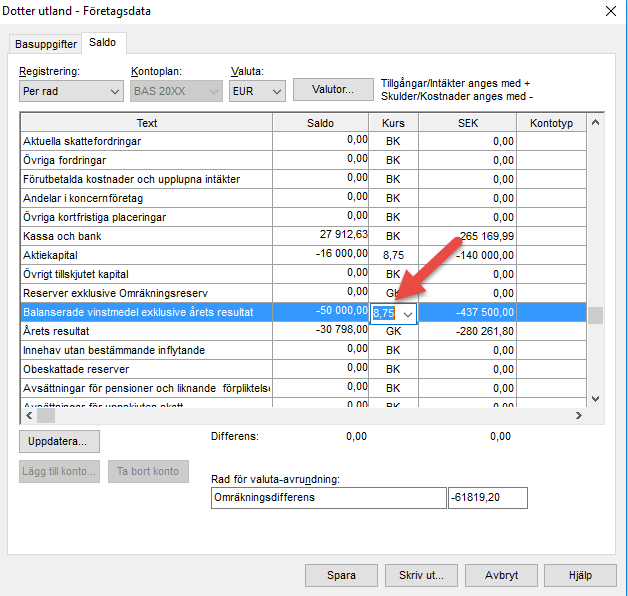 - Kursen, i exemplet ovan 8,75 skall du ange på Balanserade vinstmedel exkl. årets resultat på saldosidan efter att du bytt räkenskapsår.