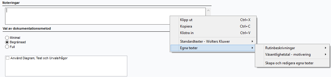 Genom att högerklicka i ett textfält var som helst i programmet visas en undermeny som innehåller alternativ för att både skapa och använda anpassade texter.