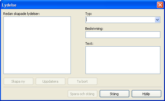 I tabellen ”Redan skapade lydelser” syns eventuellt redan skapade texter. Fältet ”Typ” används för att kategorisera texterna under valfri kategori. I fältet ”Beskrivning” ger du en rubrik till din text. Själva texten som skall visas skriver du i fältet ”Text”. När du klickar på ”Spara och stäng” sparas din text. När du är klar, stänger du ner programmet och startar det igen, så att du kan logga in med ditt vanliga användarnamn istället.