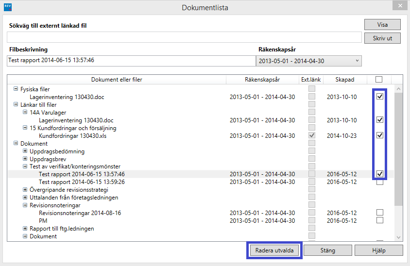 eller på tangenten ”F7” för att visa dialogen. Markera det/de dokument du vill ta bort och klicka på ”Radera utvalda”.