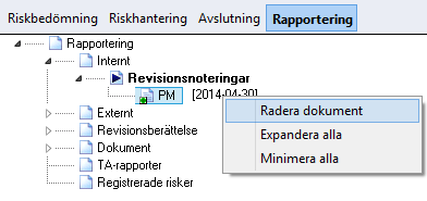 Du kan också klicka med höger musknapp på ett internt dokument direkt i trädvyn för att ta bort det via undermenyn som då visas.