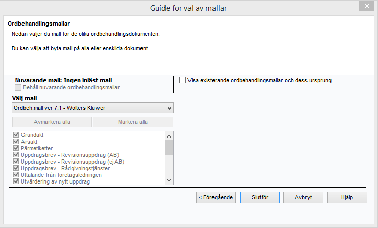 Notera - Här väljer du en ordbehandlingsmall med dokument genom att först avmarkera kryssfältet ”Behåll nuvarande ordbehandlingsmallar” och därefter välja lämplig mall i den nedfällbara listrutan - se bilden nedan. (På nya uppdrag, när man inte har valt en klientmall, står ingen mall som Nuvarande mall, så rutan Behåll… behöver/kan inte bockas ur.)