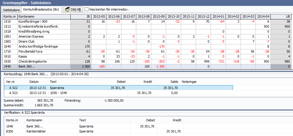 Har du även vårt program Transaktionsanalys får du tillgång till mer avancerad funktionalitet i form av fliken konto-/månadsmatris som visar månadssaldon för respektive konto vilket förenklar arbetet med att identifiera större avvikelser och belopp.