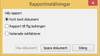 Notera - För att spara dokumentet klickar man på knappen ”Spara dokument”. Alternativet ”Visa dokument” visar endast upp rapporten utan att den samtidigt sparas.