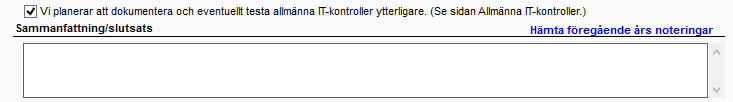Har du noterat en betydande risk som har med den aktuella rutinen att göra, blir även fältet ”Intern kontroll avseende betydande risk och planerade granskningsåtgärder” automatiskt synligt på sidan. Har du noterat en ”vanlig” risk - eller inge risk alls - så syns fältet inte.